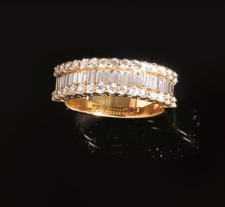 ANELLO IN ORO GIALLO E DIAMANTIcon fascia di baguette entro due linee di...