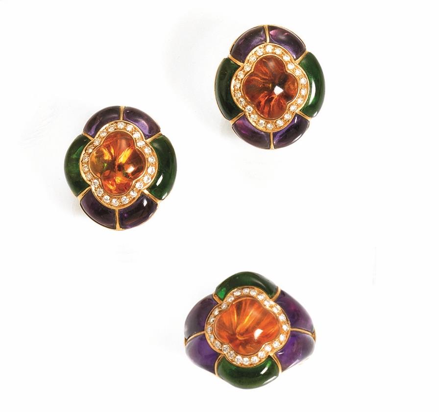 ciascun orecchino modellato come una corolla in citrino, ametista, tormalina e brillanti, l'anello analogamente decorato en suite, punzone 750, g 44 complessivi