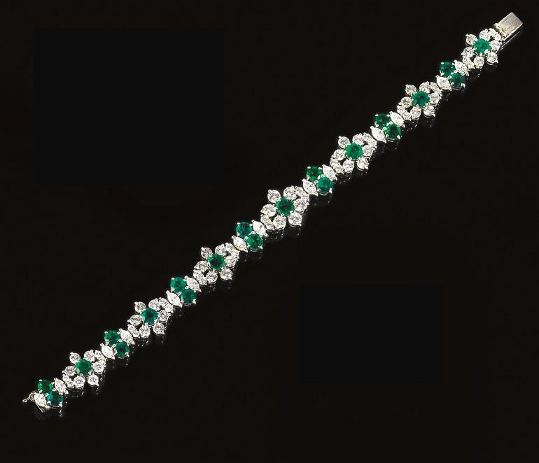 BRACCIALE IN ORO BIANCO, SMERALDI E DIAMANTIrealizzato ad una fila di corolle...