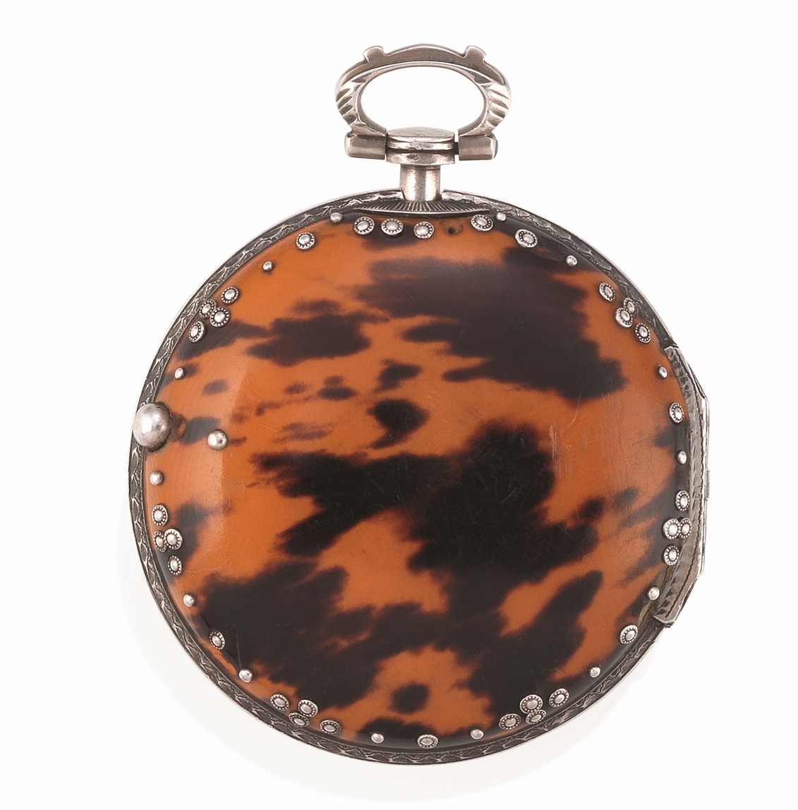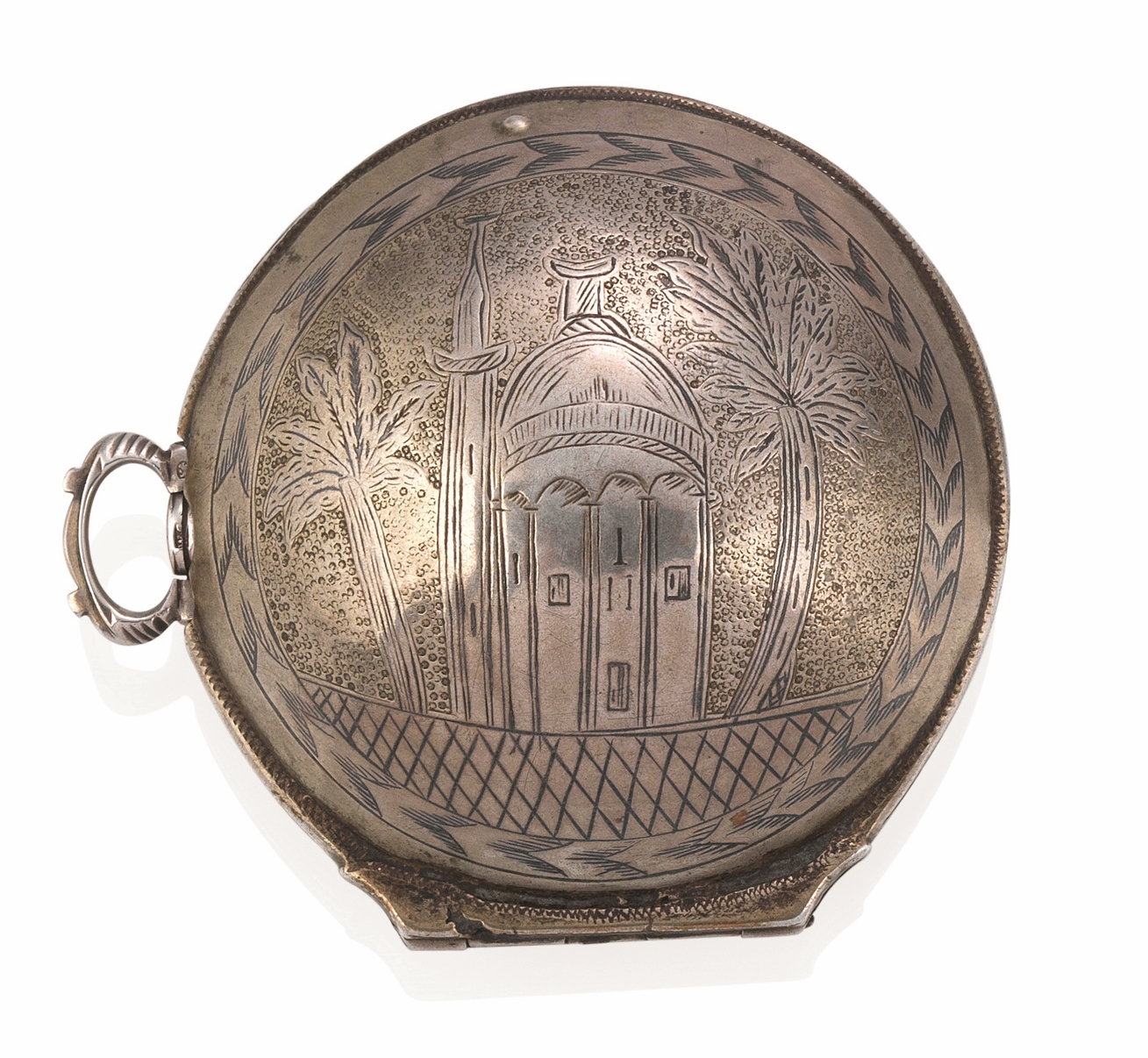 Cassa e prima controcassa in argento liscio, seconda contro-cassa in argento rivestito in tartaruga e decorato da piccole borchie circolari cesellata, terza controcassa, probabilmente di fabbricazione turca, in argento inciso a moschea con minareto tra le palme. Quadrante firmato in smalto con ore turche. Movimento firmato e numerato, riccamente cesellato, con scappamento a verga, carica e rimessa delle ore a chiavetta. Diam. mm 72