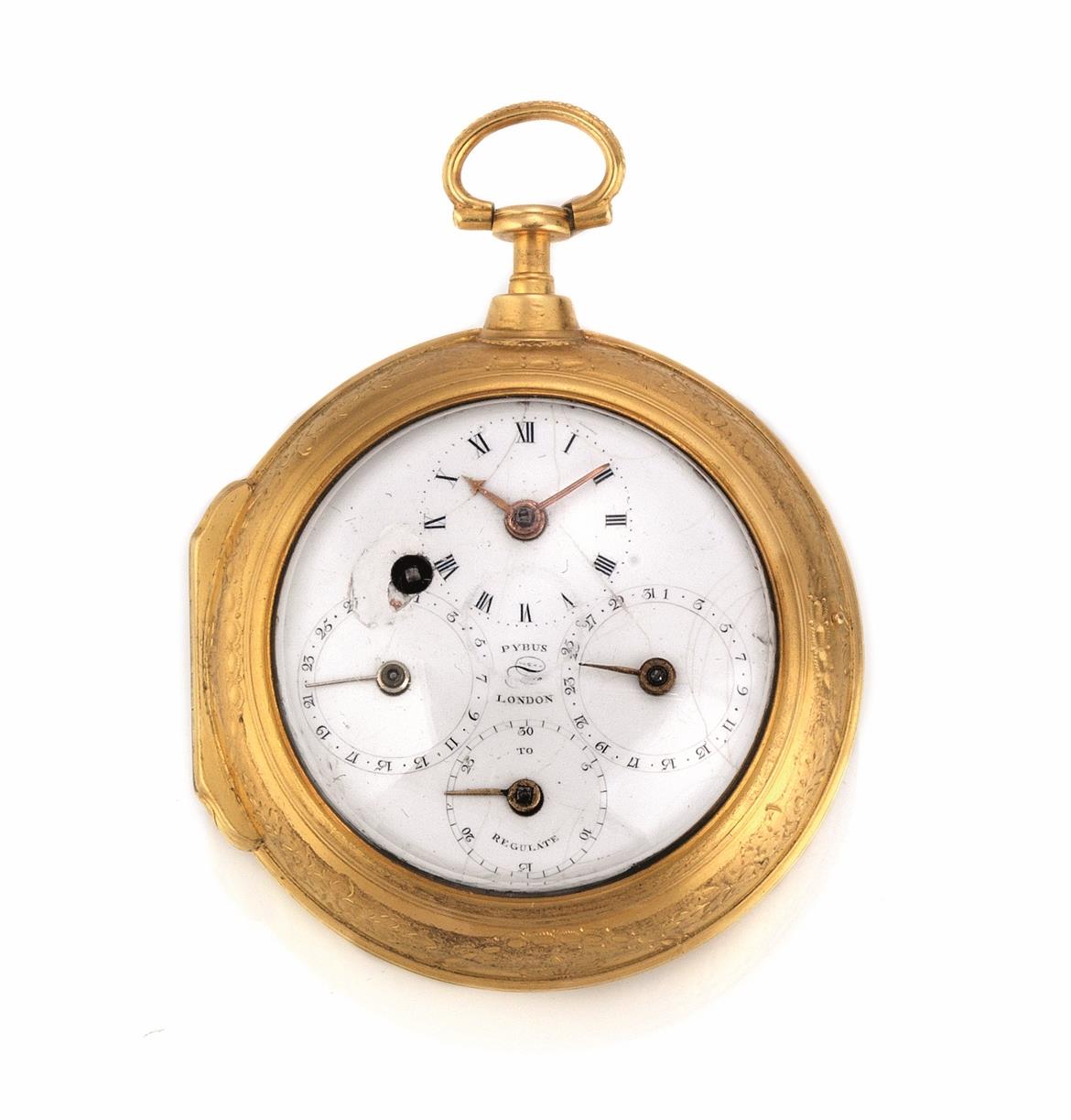 OROLOGIO DA TASCA A DOPPIO QUADRANTE CON CALENDARIO SOLARE E LUNARE, WILLIAM PYBUS, LONDON 1790 CIRCA, IN OTTONE DORATO