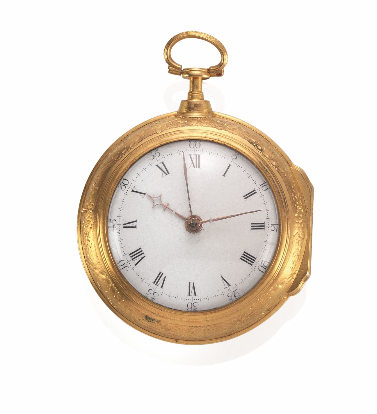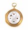 Cassa in ottone dorato cesellata a minuti motivi vegetali. Quadrante principale in smalto con ore in numeri romani e minuti in numeri arabi, lancetta dei secondi al centro; quadrante posteriore firmato con quattro piccoli quadranti rispettivamente per l’indicazione delle ore, datario, regolazione del tempo e calendario lunare. Movimento con scappamento a verga, carica e rimessa delle ore a chiavetta. Diam. mm 60