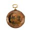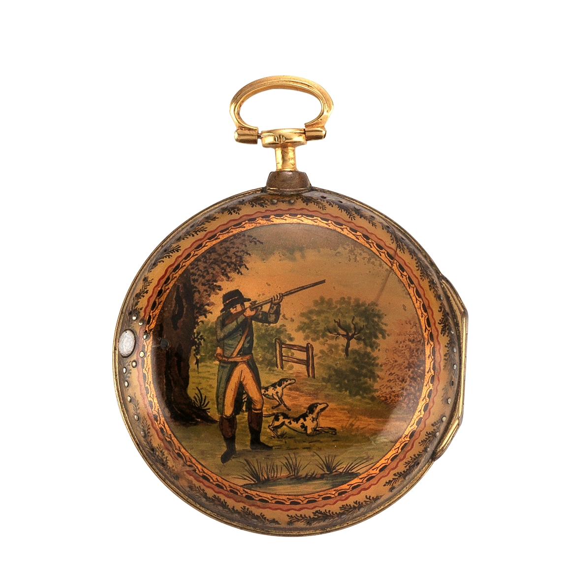 Cassa in oro giallo liscio, copri cassa rivestito in corno dipinto in policromia a scena raffigurante cacciatore con due cani. Quadrante in smalto bianco con numeri arabi. Movimento cesellato, firmato e numerato, scappamento a verga, carica e rimessa delle ore a chiavetta. Diam. mm 54