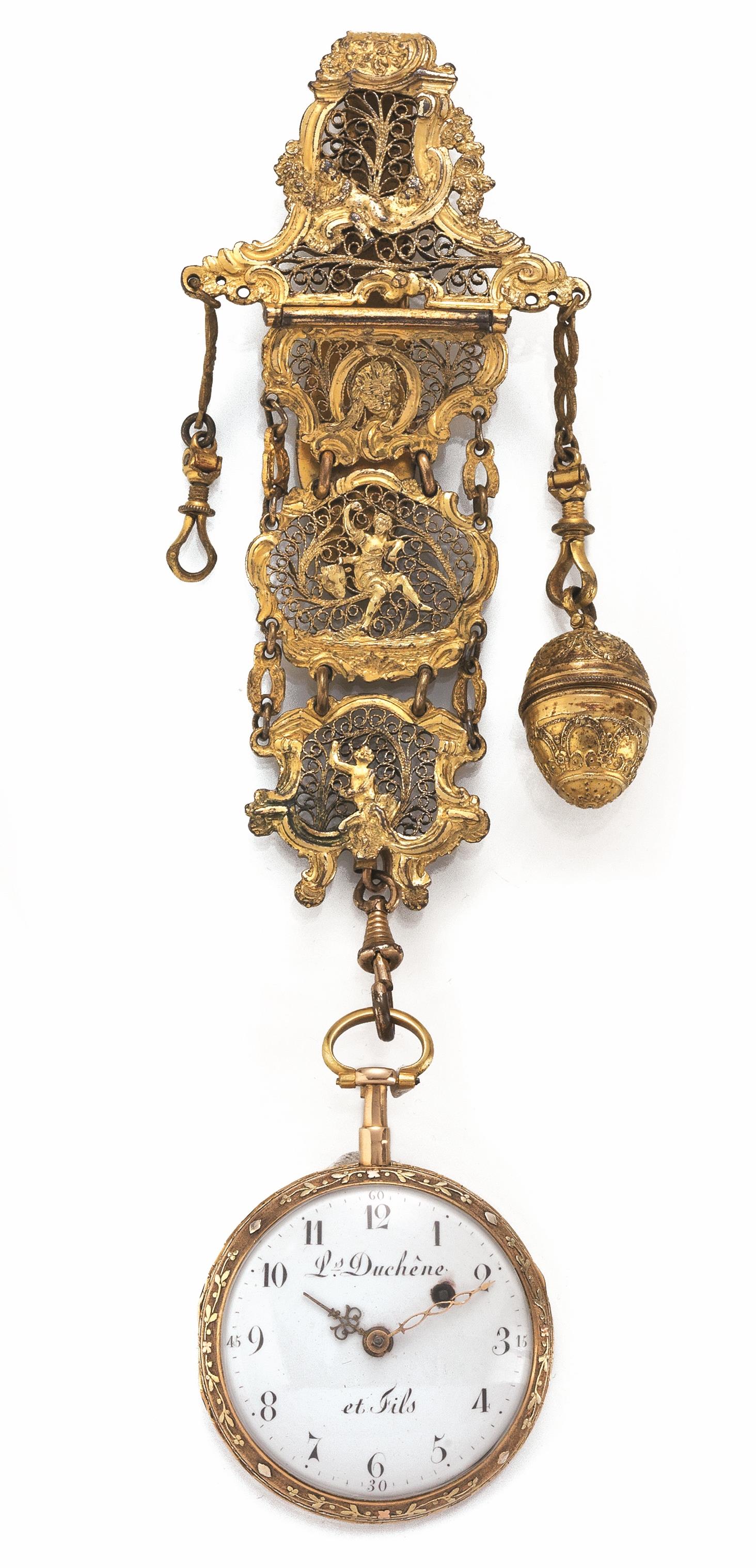 OROLOGIO DA TASCA DUCHENE & FILS, 1840 C., N. 45378, IN ORO DEI DUE COLORI CON CHATELAINE IN METALLO DORATO, FINE SEC. XVIII