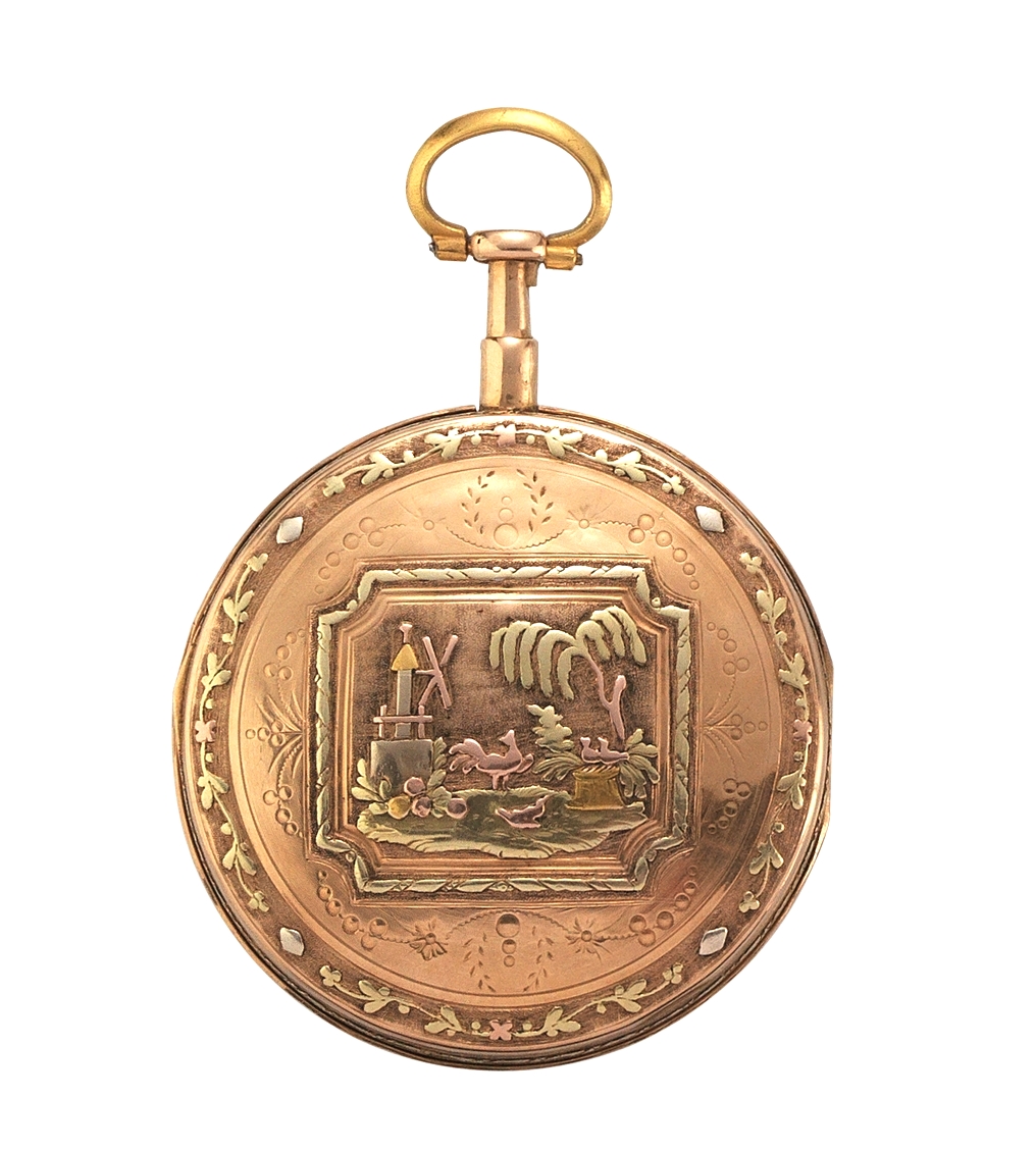 Cassa in oro giallo e oro rosa con lunette anteriore e posteriore cesellate a piccole foglie e fiori, al centro riserva sagomata entro cui è raffigurato un paesaggio con mulino e animali da cortile. Quadrante firmato con numeri arabi, lancette traforate, apertura per la chiavetta tra ore 1 e 2. Movimento firmato e numerato con scappamento a verga, carica e rimessa delle ore a chiavetta. Diam. mm 49,5. Chatelaine in metallo dorato lavorato a filigrana, formata da quattro elementi sagomati decorati da volute e putti, un pendente, apribile, a forma di uovo. Lungh. cm 14
