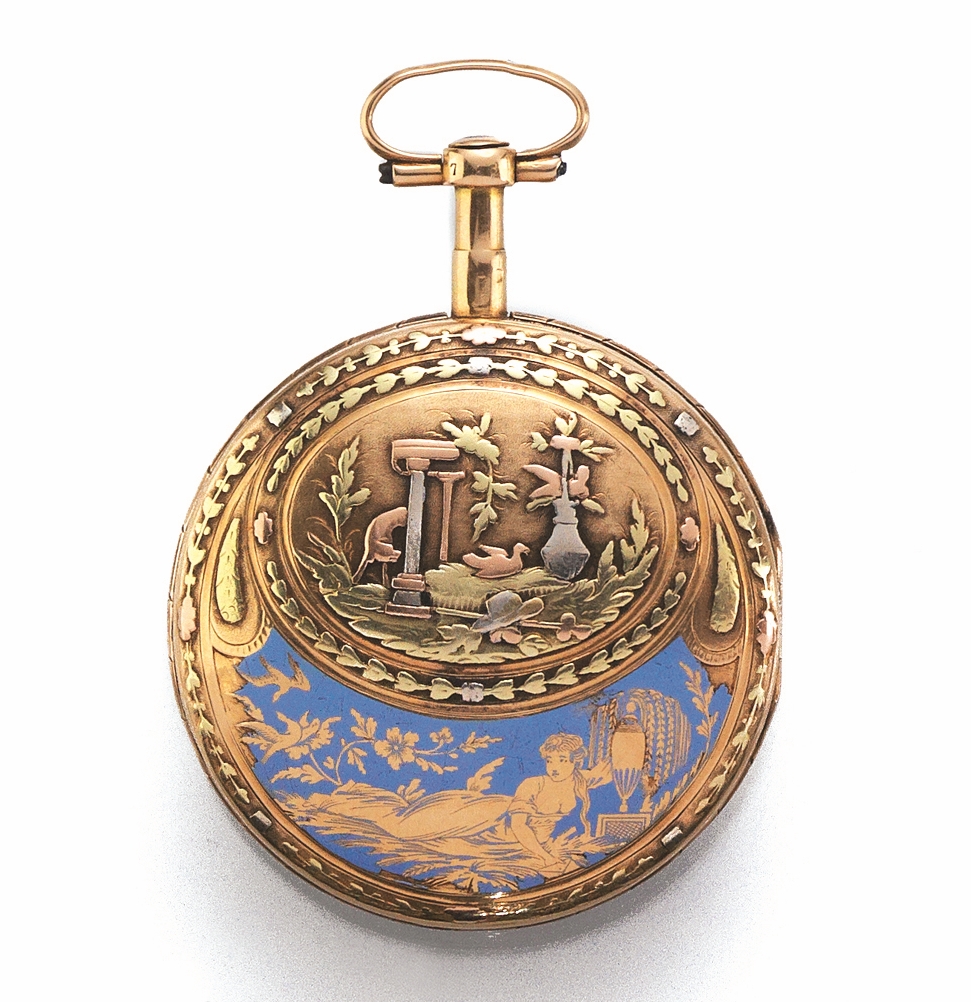 Cassa in oro rosa con riserva ovale cesellata a paesaggio architettonico in oro dei tre colori, nella parte inferiore decorazione in oro e smalto azzurro raffigurante fanciulla distesa su un prato fra volute di fiori e fogliue e vaso con fiori. Quadrante firmato in smalto bianco con numeri arabi, apertura per la chiavetta tra ore 1 e 2, lancette traforate. Movimento con scappamento a verga, carica e rimessa delle ore a chiavetta. Diam. mm 47