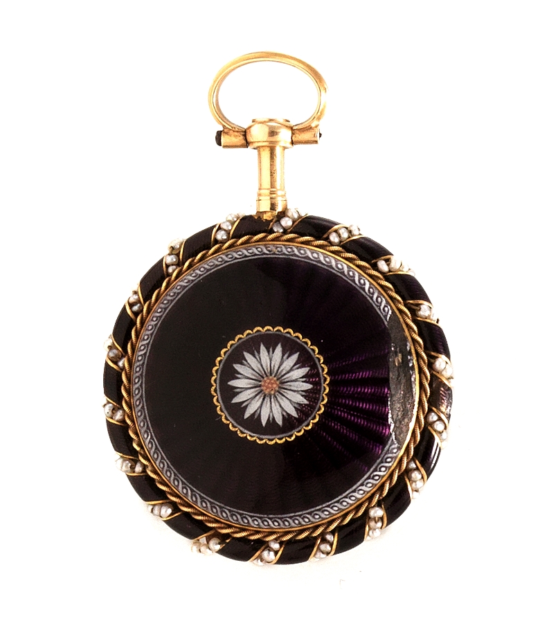 Cassa in oro giallo interamente rivestita in smalto blu con riserva circolare con corolla e profilata da motivo a cordonetto in smalto e microperle. Quadrante firmato con ore in numeri romani e secondi in numeri arabi, apertura per la chiavetta a ore 2. Movimento con scappamento a verga, carica e rimessa delle ore a chiavetta. Diam. mm 37