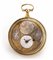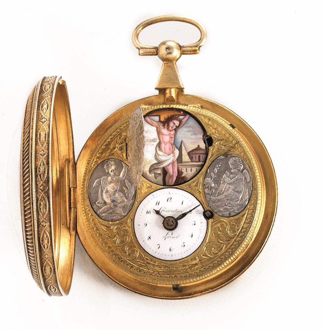 Cassa liscia con carrure cesellata a motivi geometrici e lunette godronate. Quadrante in ottone dorato cesellato a volute, disco orario decentrato con ore in numeri arabi, nella parte superiore tre medaglioni in argento cesellato raffiguranti Cupido, sotto il medaglione centrale di forma circolare montato su cardine è celata una miniatura policroma raffigurante la Crocifissione. Movimento firmato con scappamento a verga, carica e rimessa delle ore a chiavetta. Diam. mm 59