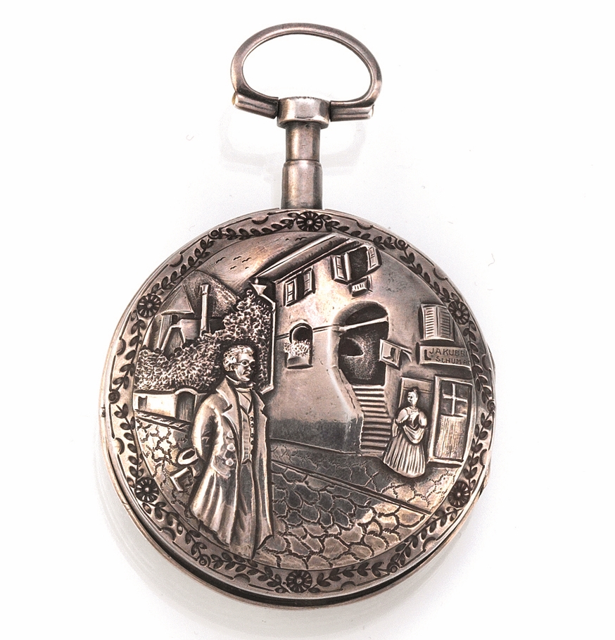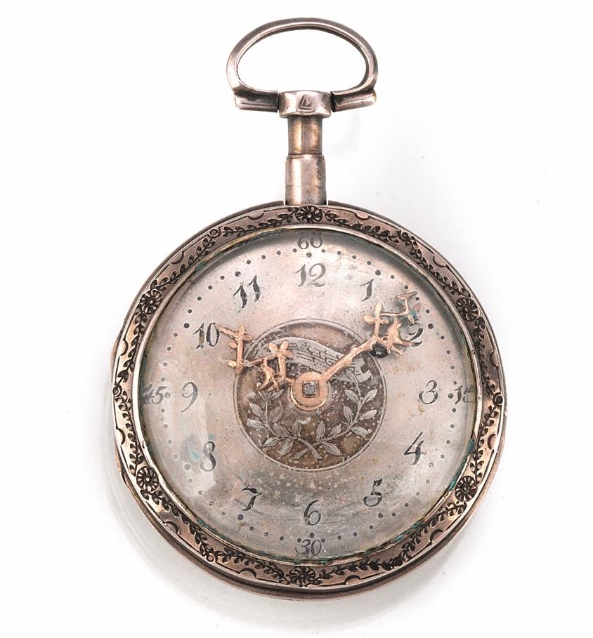 Cassa in argento sbalzato a scena tratta dall’operetta di Schubert Le tre sorelle, lunetta cesellata a motivi floreali. Quadrante argento con numeri arabi, parte centrale cesellata a cartiglio con spartito musicale e serto di foglie, lancette oro cesellate a forma di rametto di albero con uccellino. Movimento firmato con scappamento a verga, carica e rimessa delle ore a chiavetta. Diam. mm 48