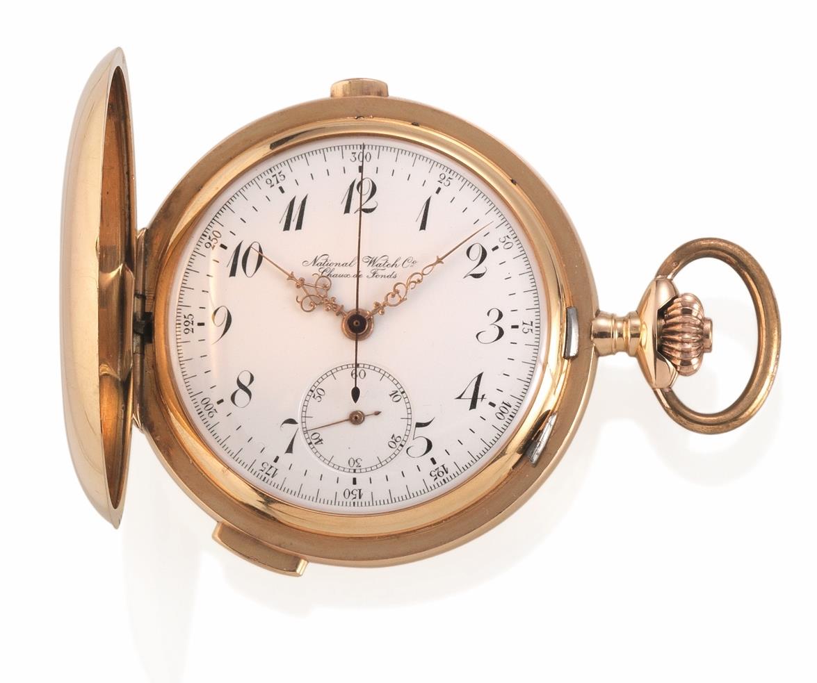 OROLOGIO DA TASCA CON CRONOMETRO E RIPETIZIONE, NATIONAL WATCH CO. CHAUX DE FONDS, CASSA N. 1873, 1920 CIRCA, IN ORO GIALLO 18 KT E CATENA DA OROLOGIO CON STERLINA ORO