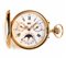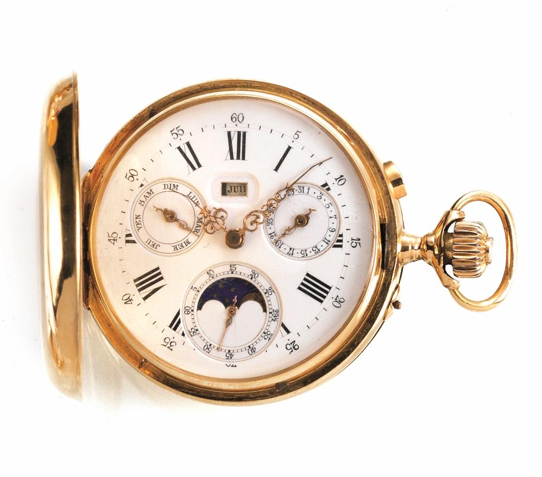 Cassa in oro liscio a savonnette. Quadrante bianco con ore in numeri romani e minuti in numeri arabi, tre quadranti ausiliari a ore, 3, 6 e 9 rispettivamente con datario, secondi continui e apertura per le fasi lunari, giorni della settimana, finestrella per il mese a ore 12, lancette traforate. Movimento a carica su corona con scappamento ad ancora. Diam. mm 50