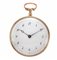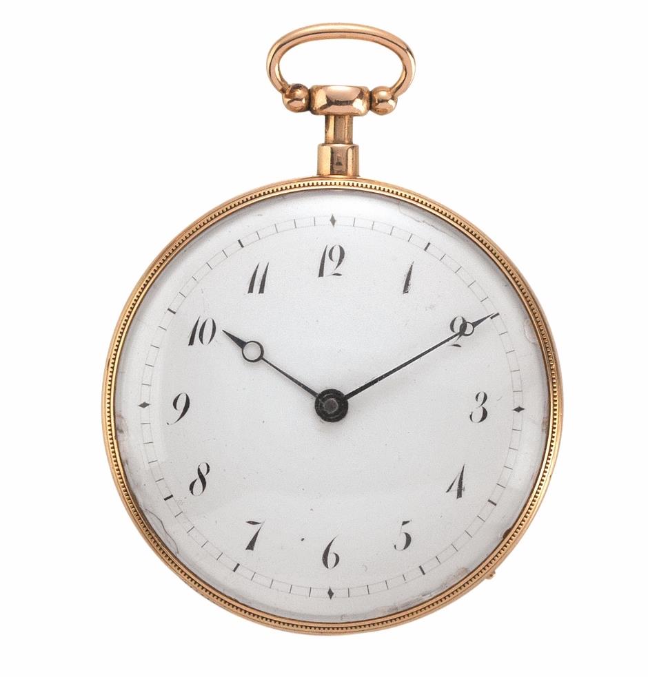 Cassa in oro liscio, carrure godronata. Quadrante in smalto bianco con numeri arabi Breguet, lancette traforate. Movimento con scappamento a verga, suoneria ore e quarti, carica e rimessa delle ore a chiavetta. Diam. mm 55