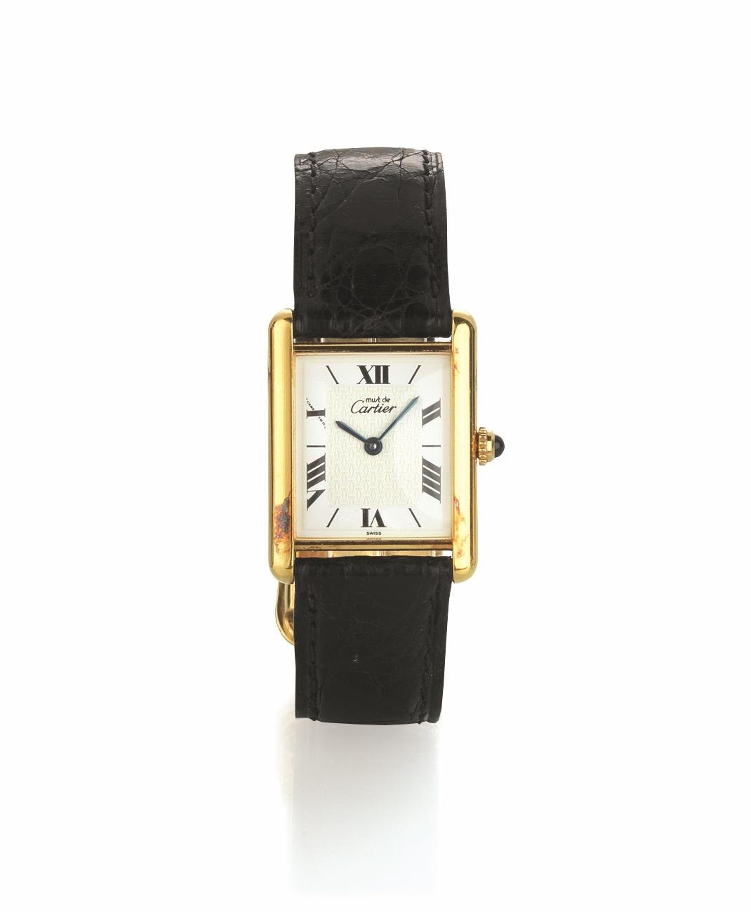 Cassa rettangolare con fondello chiuso da quattro viti sui fianchi, corona di carica con zaffiro cabochon, vetro zaffiro. Quadrante avorio con numeri romani e indici a bastone radiali, lancette a spada blu. Movimento al quarzo. Cinturino in pelle con chiusura deployante in vermeil Cartier. Dim. mm 22x30
