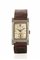 Cassa rettangolare in due corpi dal profilo geometrizzato, fondello a scatto, vetro plastica. Quadrante argentè con numero arabo e indci a bastone, secondi a ore 6, lancette a bastone blu. Movimento firmato a carica manuale. Cinturino in pelle con fibbia ad ardiglione in metallo non pertinenti. Dim. mm 40,5x25