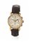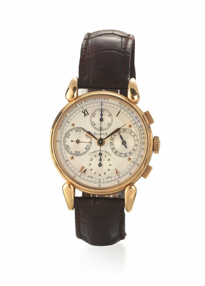 Cassa massiccia in tre corpi, fondello a scatto con oblò in vetro zaffiro a vista sul movimento, pulsanti cronografici rettangolari, anse a goccia. Quadrante argentè in due toni con indici applicati a punta di diamante e numeri romani, scala pulsometrica periferica, quattro quadranti ausiliari ad ore 3,6, 9 e 12 rispettivamente con datario, registro delle 12 ore, secondi conitnui e registro dei 30 minuti, lancette oro, secondi cronografici blu al centro. Movimento firmato a carica automatica. Cinturino in pelle con fibbia deployante in oro rosa 18 kt Chronoswiss. Diam. mm 37, spessore mm 14