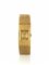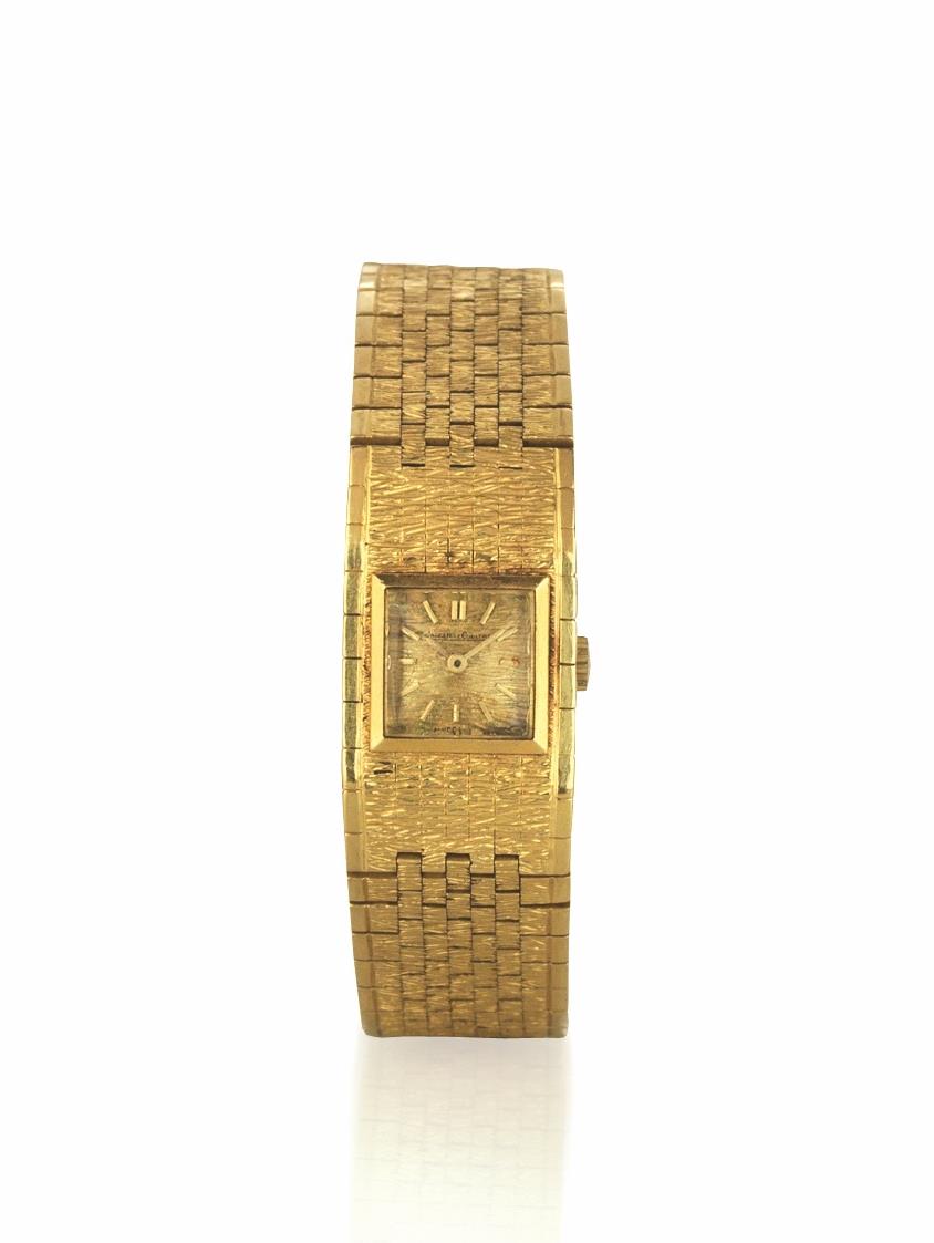 Cassa carrè integrata nel bracciale, fondello a scatto, lunetta lavorata ad effetto satinato analogo a quello del bracciale. Quadrante oro inciso, indici applicati a bastone, lancette Dauphine. Movimento a carica manuale firmato. Bracciale a nastro a maglie satinate e incise, chiusura deployante analogamente incisa. Dim. 18x17