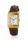 Cassa rettangolare reversibile in oro giallo con vetri zaffiro. Quadrante principale argentè con riserva centrale rettangolare guillochè, numeri arabi, secondi a ore 6, lancette a spada blu; quadrante posteriore argentè guillochè con riserva centrale e quadrantino dei secondi incisi a motivi radiale, anello delle ore argentè con numeri arabi e indici triangolari oro applicati, secondi a ore 6, lancette Dauphine. Movimento firmato a carica automatica. Cinturino in pelle con fibbia a ardiglione in oro giallo Jaeger le Coultre. Dim. mm 42x26