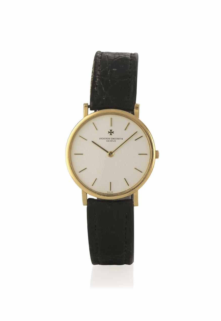 Cassa piatta in due corpi con fondello a scatto, vetro zaffiro. Quadrante bianco con indici a bastone applicati, lancette ad ago oro con inserto in smalto nero. Movimento firmato a carica manuale calibro 1003/1 firmato e numerato. Cinturino in pelle e fibbia in oro giallo ad ardiglione con croce di Malta Vacheron Constantin. Diam. mm 31