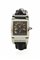 Cassa carrè massicia in acciaio lucido con anse snodate, fondello con oblò in vetro zaffiro chiuso da quattro viti a vista sul movimento, vetro zaffiro, corona con diamante nero sfaccettato, Quadrante nero con indici in numeri arabi applicati, quadrante secondario con secondo fuso orario in basso con indici applicati a bastone, lancette dauphine in oro rosa, datario tra ore 7 e 8 con doppio disco per le unità e le decine. Movimento a carica automatica. Cinturino in pelle con chiusura deployante in acciaio De Grisogono. Dim. mm 33x33