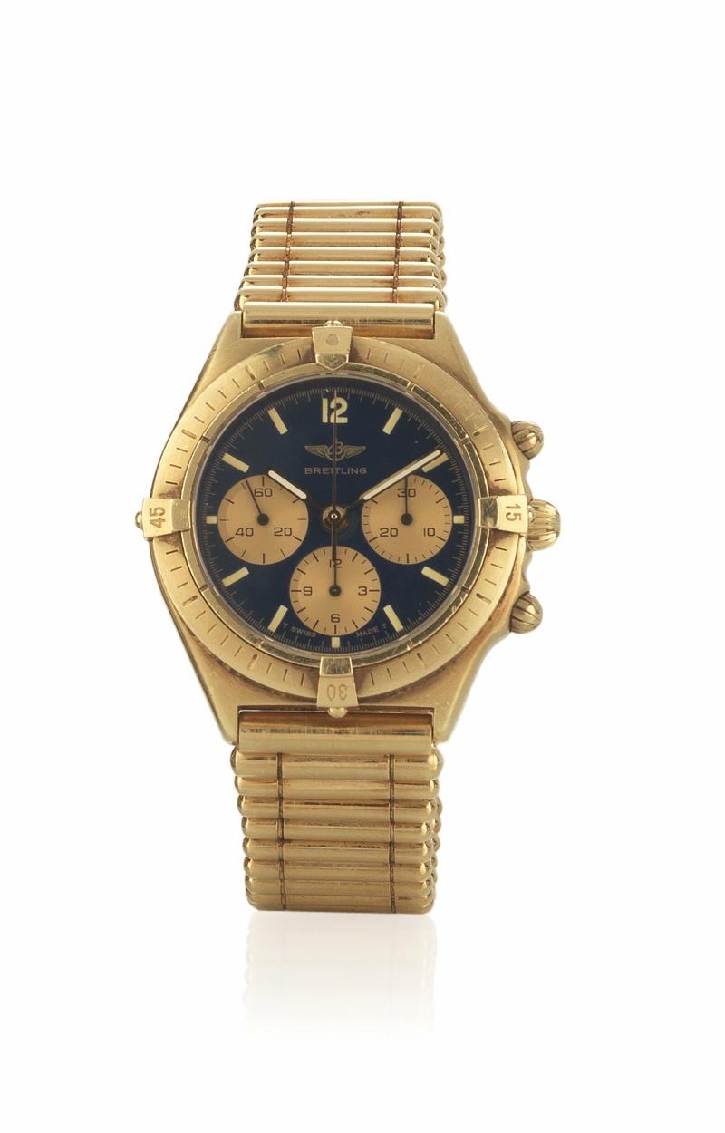 Cassa in tre corpi con fondello a vite, pulsanti cronografici tondi, lunetta girevole graduata, vetro zaffiro. Quadrante bicolore blu e oro con indici abastone applicati in materiale luminescente, tre quadranti ausiliari a ore 3,6,e 9 rispettivamente con registro dei 30 minuti selle 12 ore e seondi continui, lancette a bastone con inserto in materiale luminescente, secondi cronografici oro al centro. Movimento firmato a carica automatica. Bracciale a maglie a barretta in oro giallo 18 kt con chiusra deployante a scomparsa Breitling. Diam. mm 36