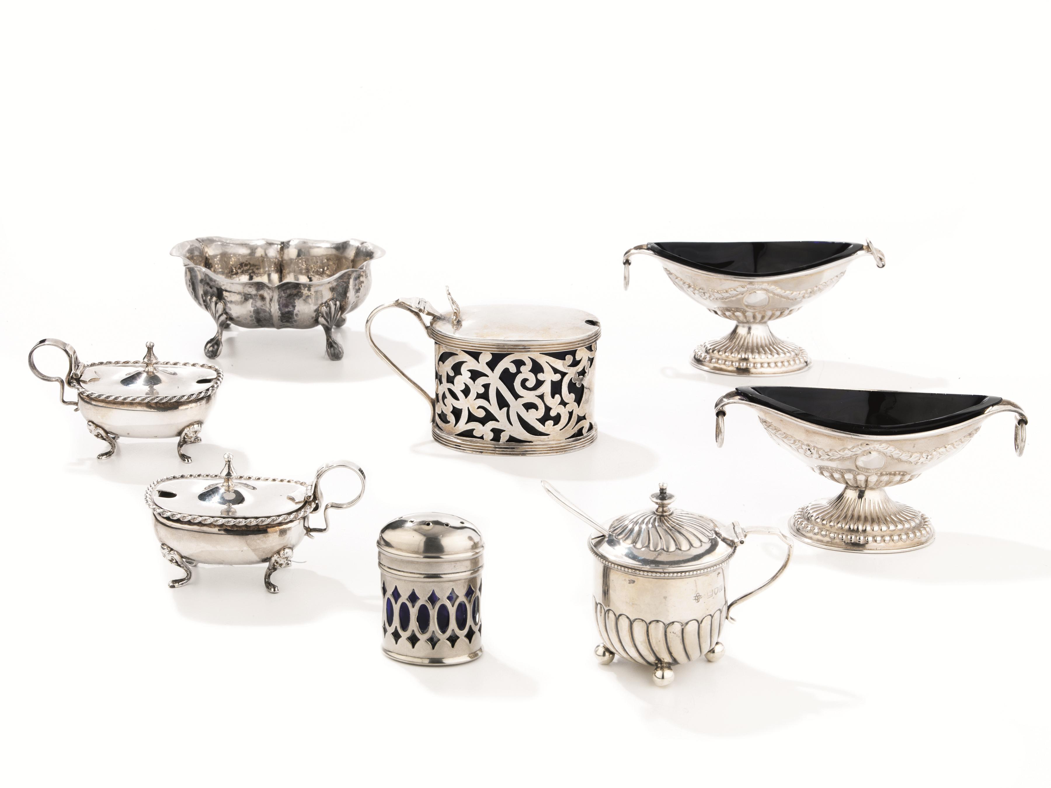 in argento, le prime in forma di navette con vetri blu, le seconde di forma ovale poggianti su quattro piedini, complessivi g 160