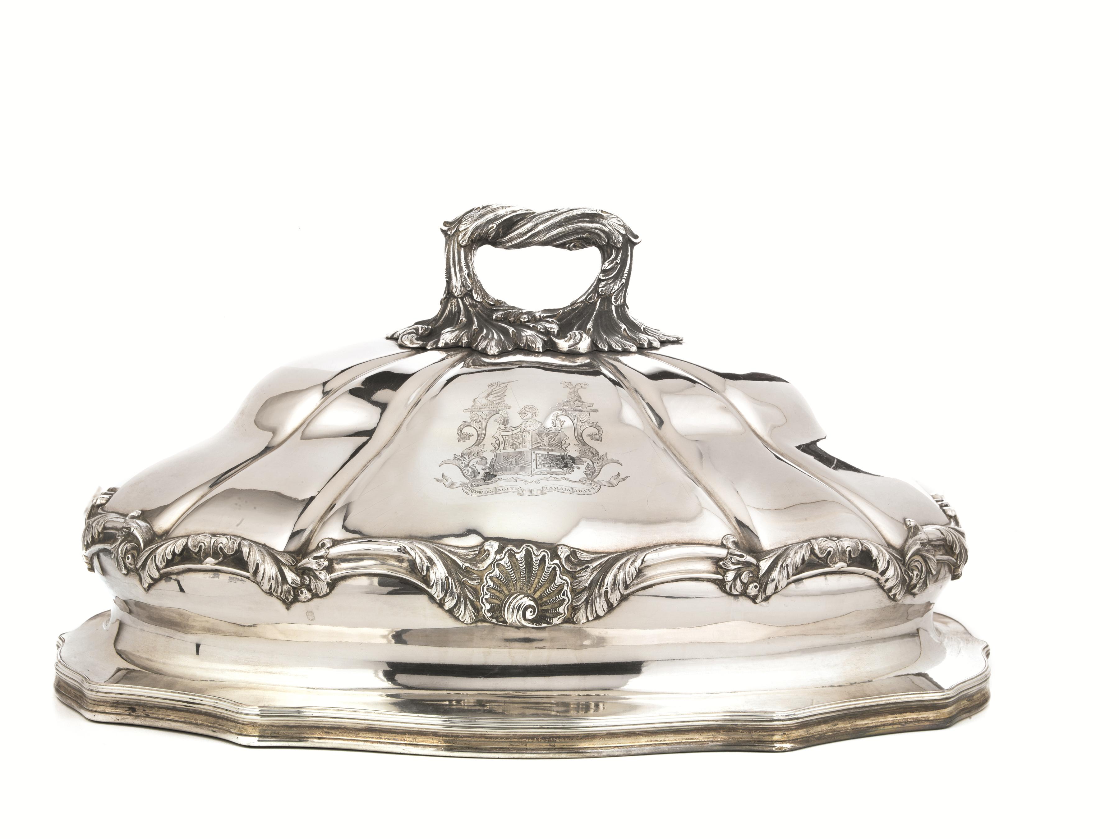 in sheffield plate di forma ovale con decoro a tralcio di volute fogliacee e stemma nobiliare inciso con cartiglio iscritto toutjours agite jamais abbate, presa a foglie contrappote, cm 45x34