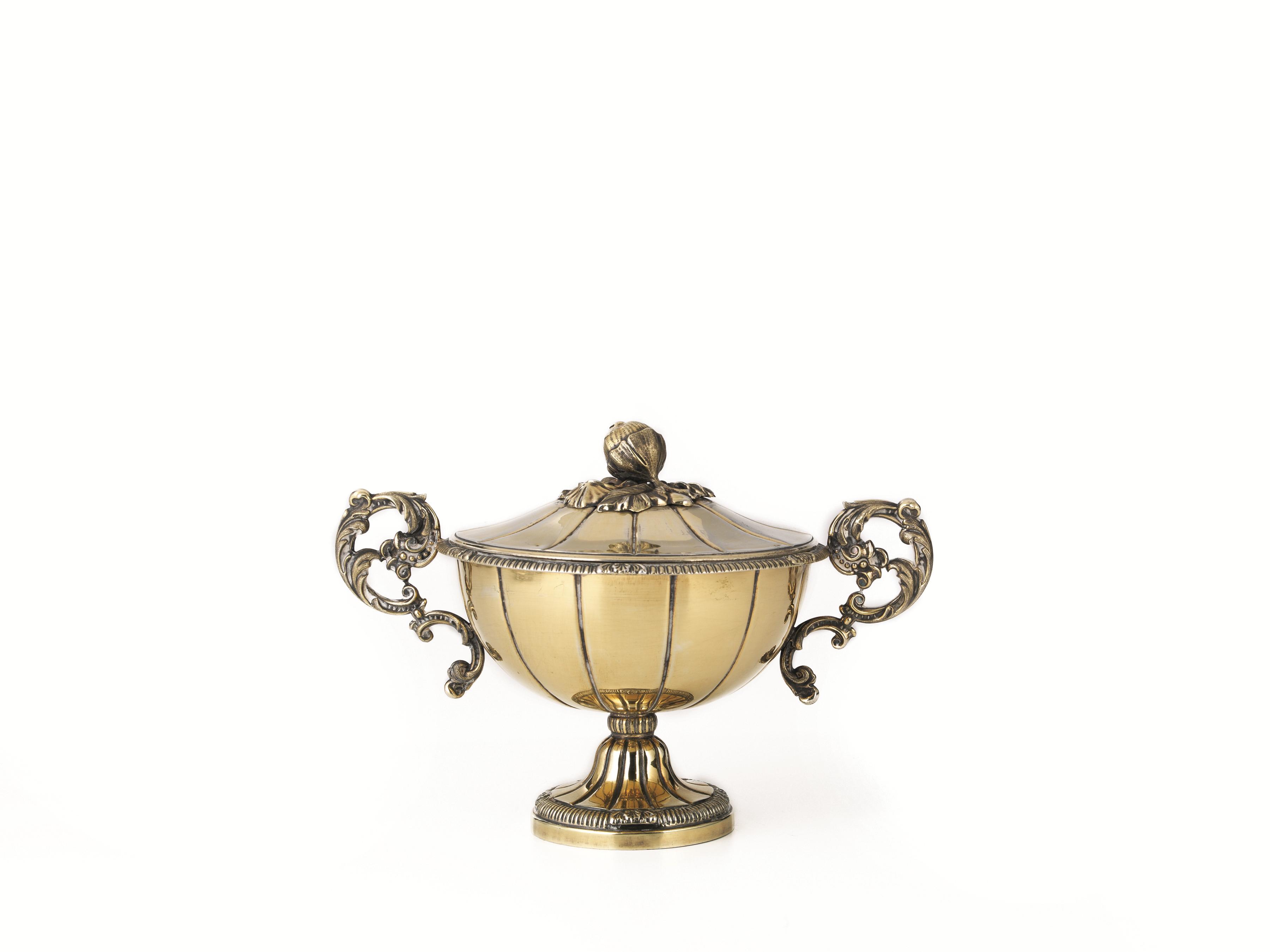 in vermeil, base, coppa e coperchio a spicchi, due anse a doppia voluta, presa del coperchio a ghianda, g 430 diam. cm 15, lieve ammaccatura