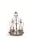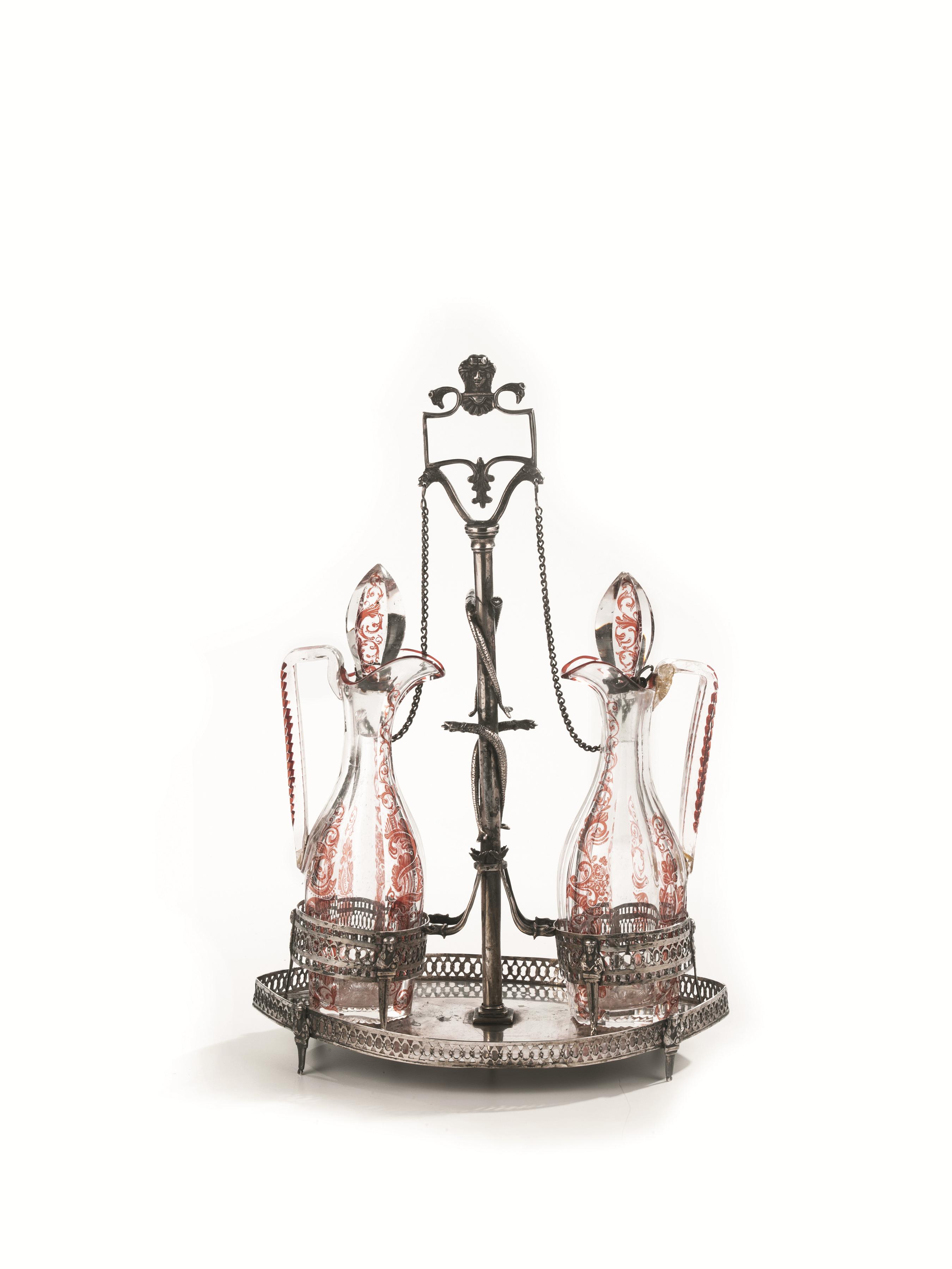in argento, base a navette con bordo traforato, fusto centrale a colonna lungo cui si attorcigliano serpenti, presa geometrica, completa di ampolle, alt. cm 37, g 751
