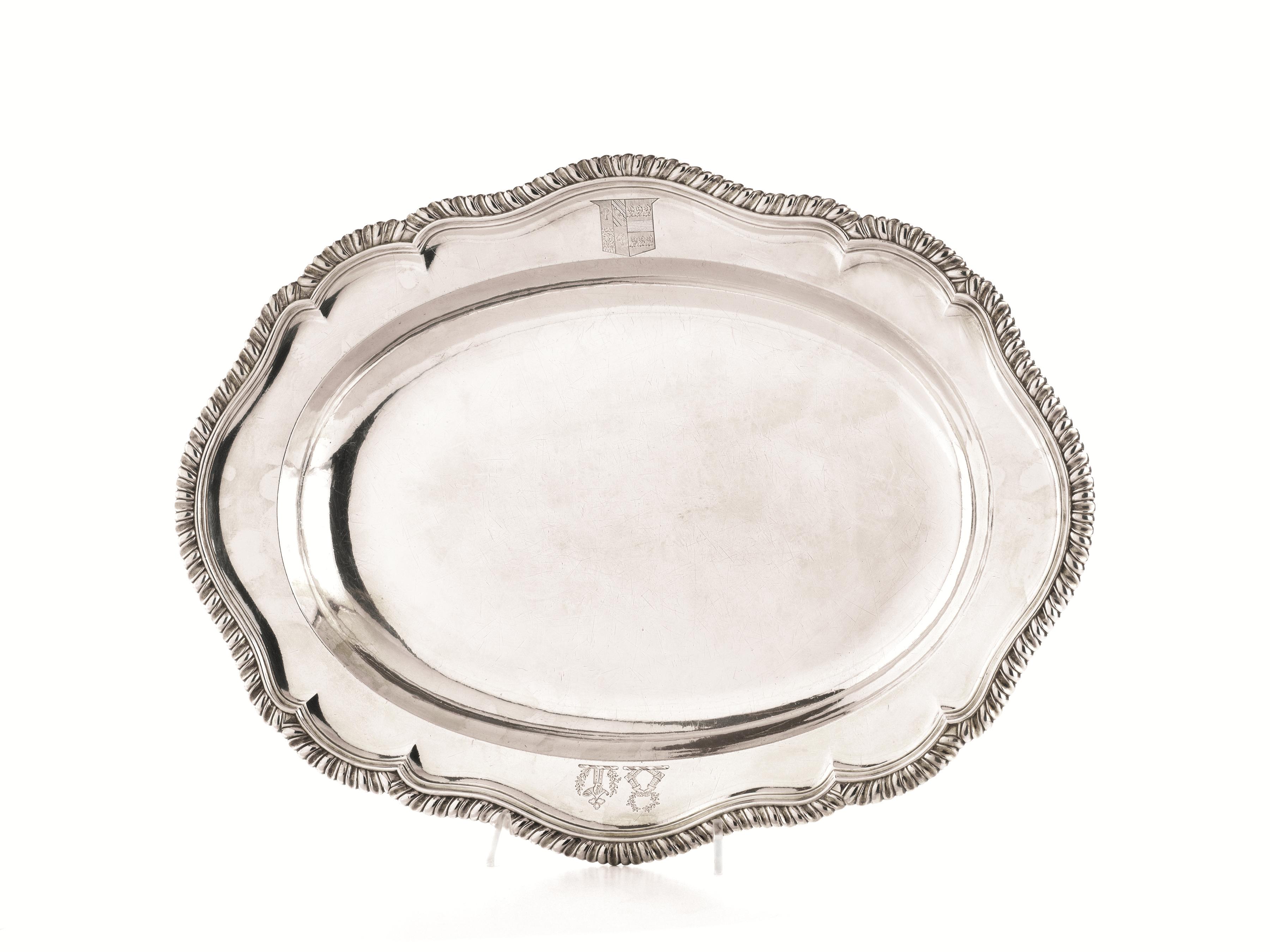 di forma ovale sagomata, tesa decorata da stemma nobiliare inciso, bordo a baccellature, cm 46x34, g 2045. Reca sul fondo l'etichetta in carta della Collezione Bulgari-Roma
