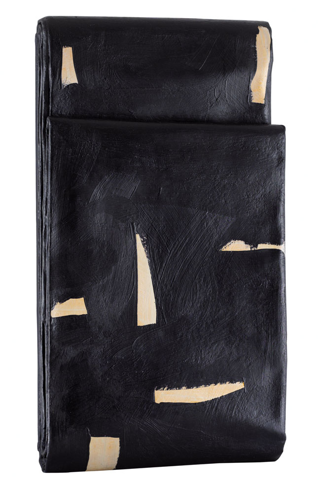 CESARE BERLINGERI Cittanova (Rc) 06/03/1948 Piegare la notte, 1991 tecnica mista su tele piegate intelaiate cm. 66x34x9, firma, titolo, anno e dedica dell'artista ad personam al retro, dichiarazione d'autenticità dell'artista su foto, opera registrata presso l'Archivio delle opere di Berlingeri al numero A 3110-0037 come da dichiarazione della Galleria Dante Vecchiato (PD) su foto, opera senza cornice.