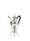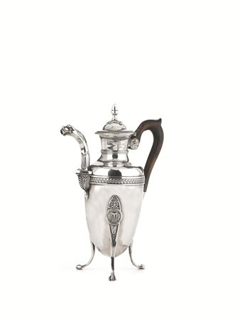 corpo piriforme ornato da un nastro di piccole foglie, tre piedini terminanti a zampa ferina, beccuccio a testa di animale, presa a voluta in legno, alt. cm 20, g 290