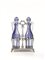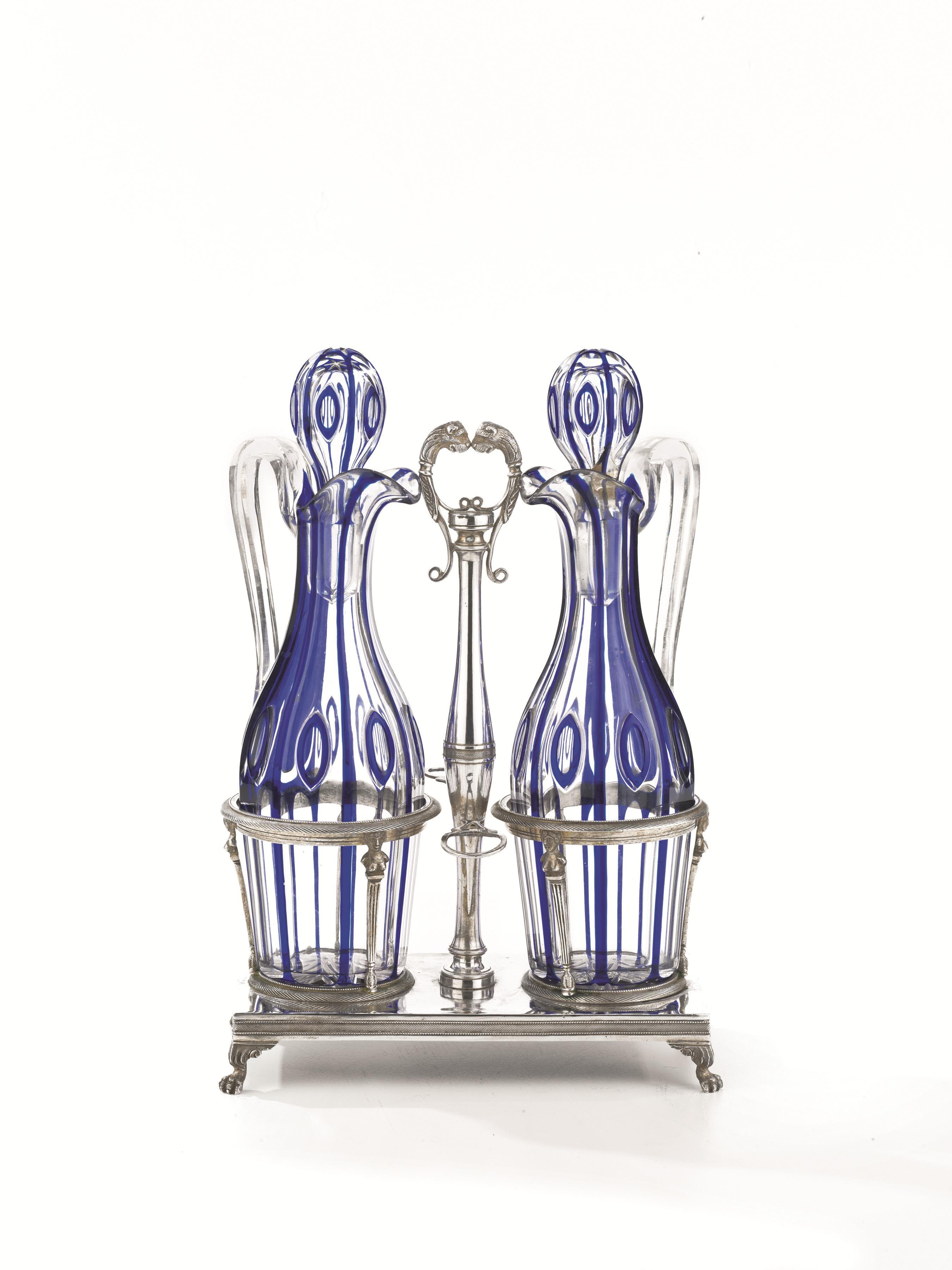 in argento, base rettangolare poggiante su quattro piedini a zampa ferina, fusto sagomato con finale a due teste leonine contrapposte, completa di ampolle in vetro trasparente e blu, alt. cm 25, g 670