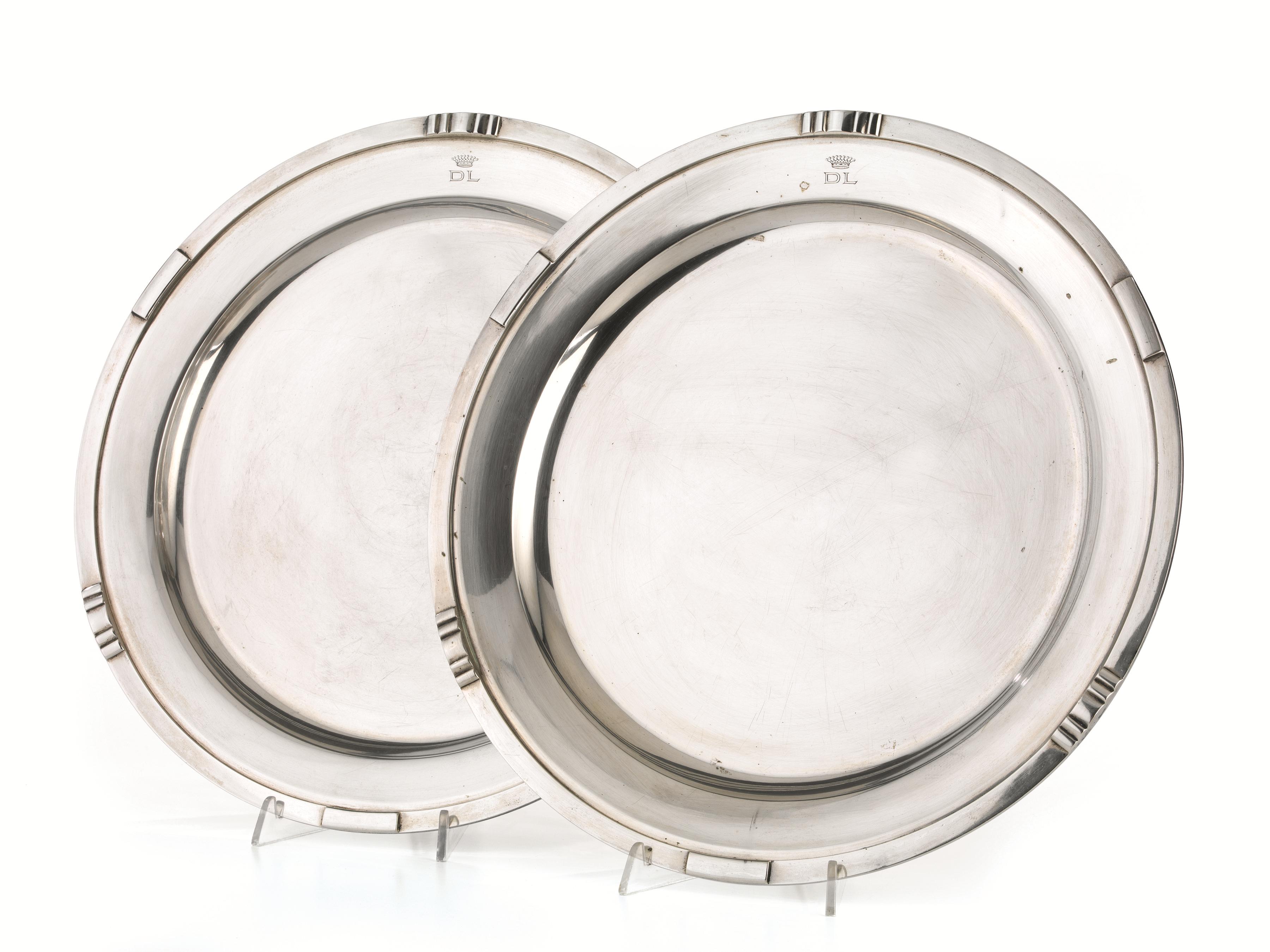 bordi scanalati e decoratti con monogramma DL coronato, diam. cm 40, g 3475 (2)