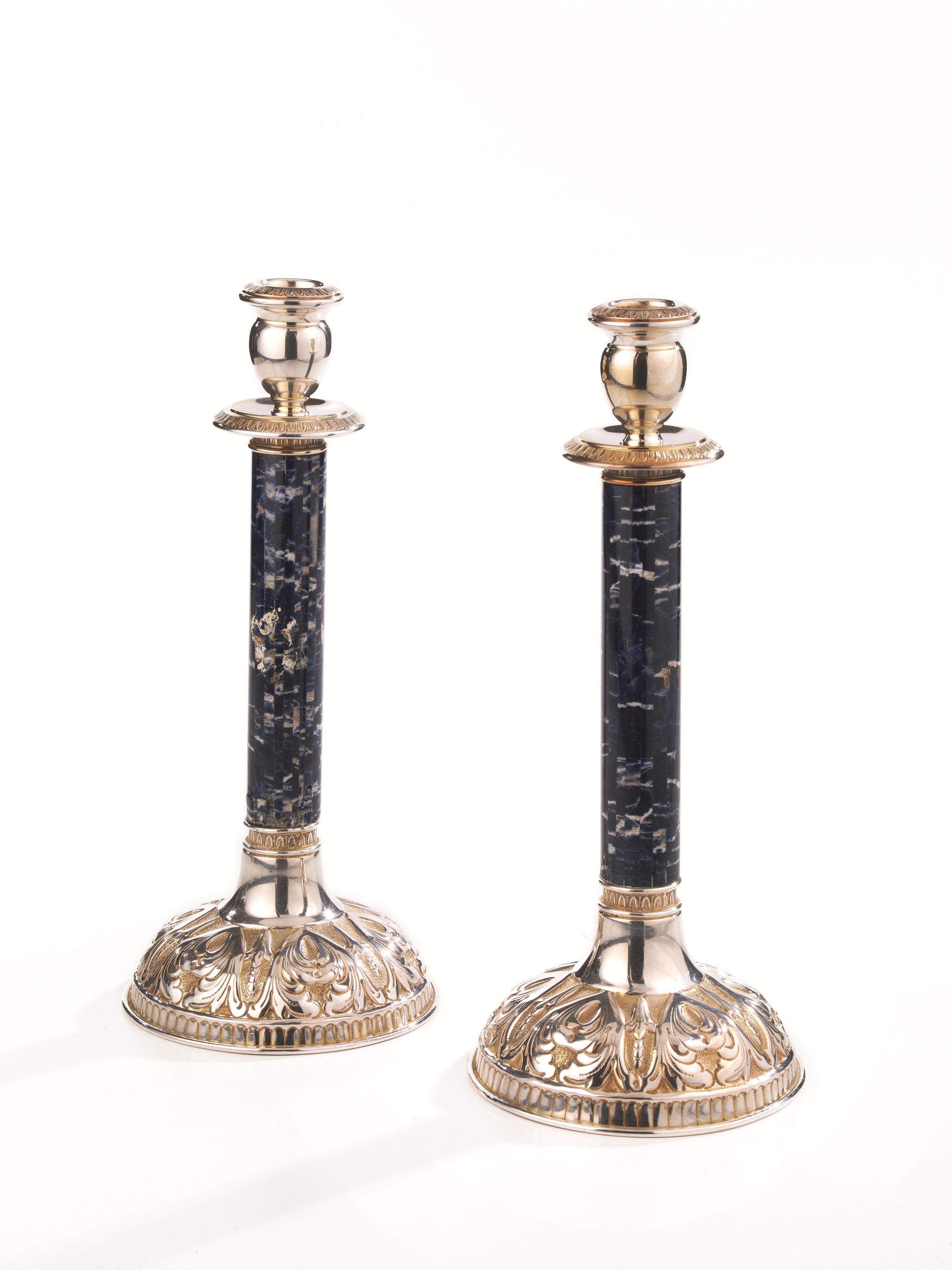 COPPIA DI CANDELIERI, MANIFATTURA FABERGE', SECOLO XXfusto in lapislazuli su...