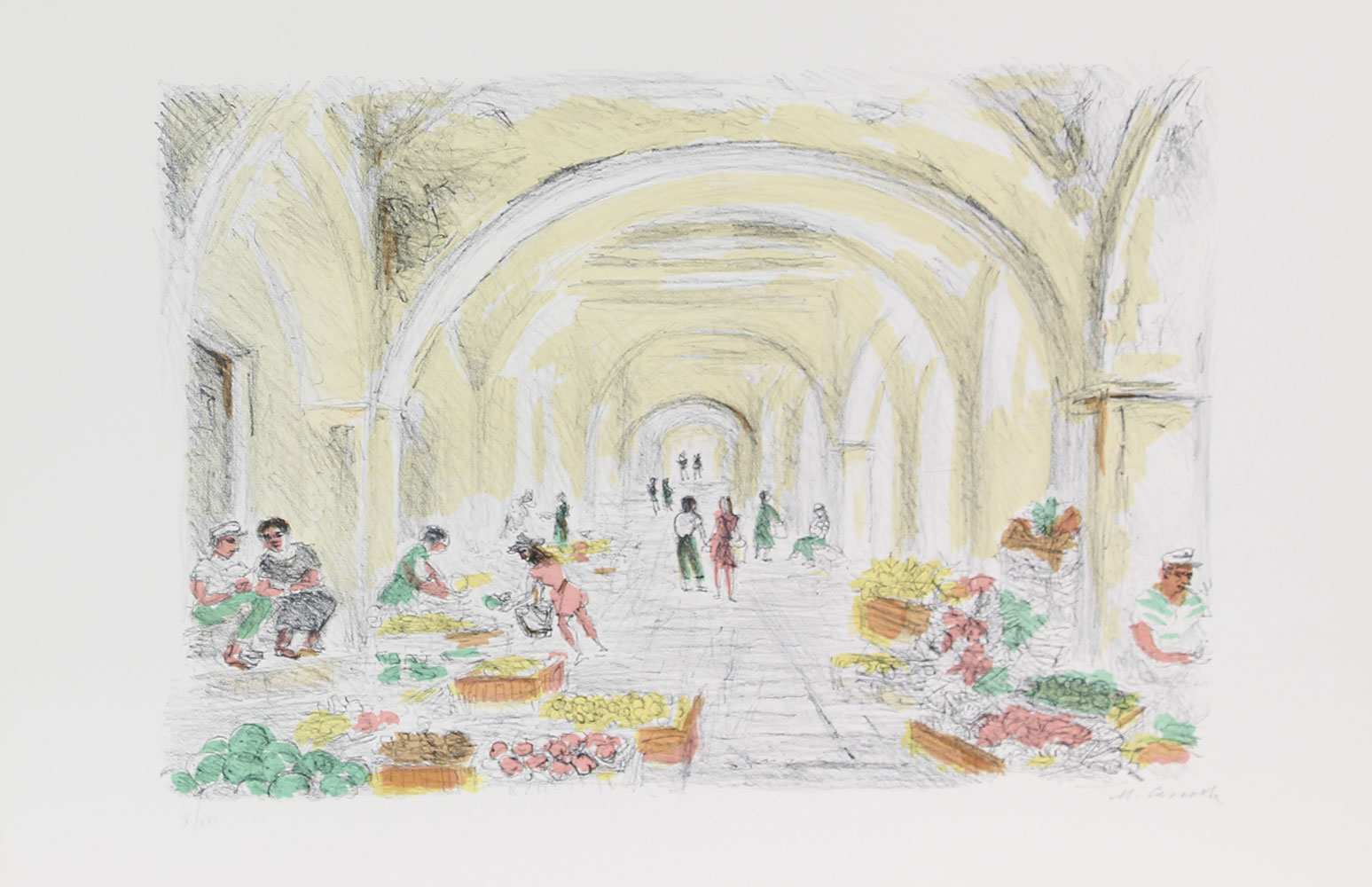 Cascella Michele Mercato a Portofino litografia su carta, cm. 44,5x76,5, es. V/XXV firmata in basso a destra, timbro a secco "Graphis Arte" di Livorno in basso a destra senza cornice