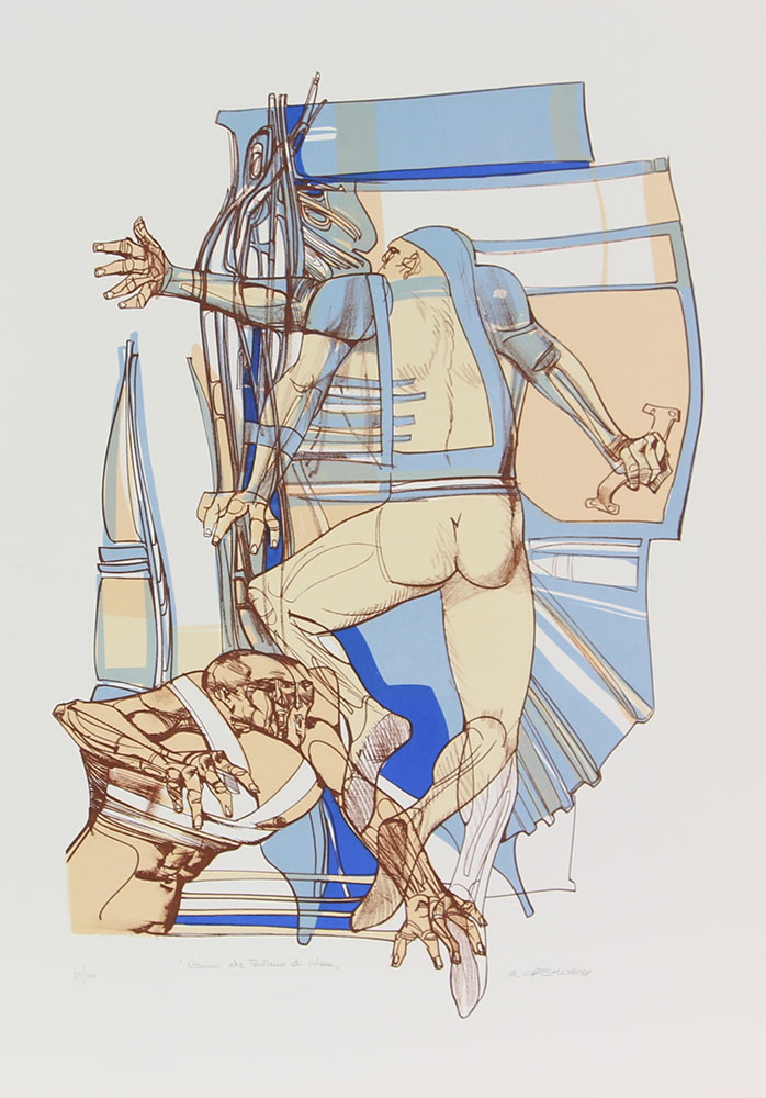 Cremonini Walter Uomini che Tentano di Volare litografia su carta, cm. 70x50, es. 87/100 firmata in basso a destra, intitolata in basso a sinistra, timbro a secco in basso a sinistra, certificato di autenticità della Litoinvest di Milano senza cornice