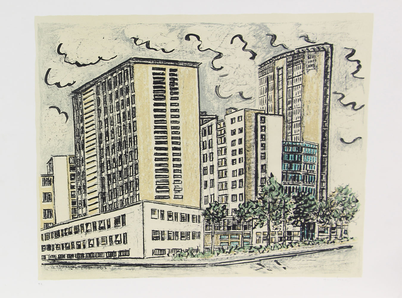 Tamburi Orfeo Milano litografia su carta, cm. 59,5x79,5, es. prova d'autore firmata in basso a destra, timbro a secco "Graphis Arte" di Livorno in basso a destra senza cornice
