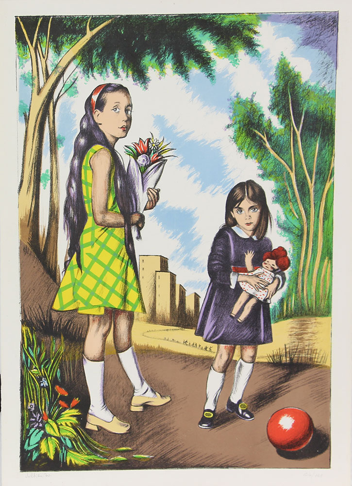 Sciltian Gregorio Due bambine, 1970 litografia su carta, cm. 70x50, es....