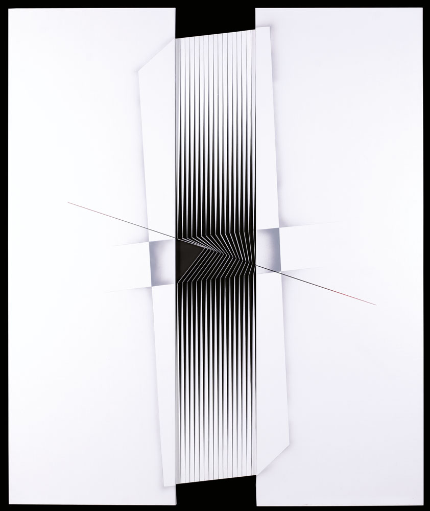 ALBERTO BIASI Padova 02/06/1937 Aperto all'instabilità, 2005 tecnica mista ed assemblaggio di tele e legni cm. 180x149x4,5; firma, anno e timbri della Casa del Mantegna, Provincia di Mantova al retro, dichiarazione d'autenticità dell'artista e Archivio Alberto Biasi numero AS.77 su foto, opera senza cornice.