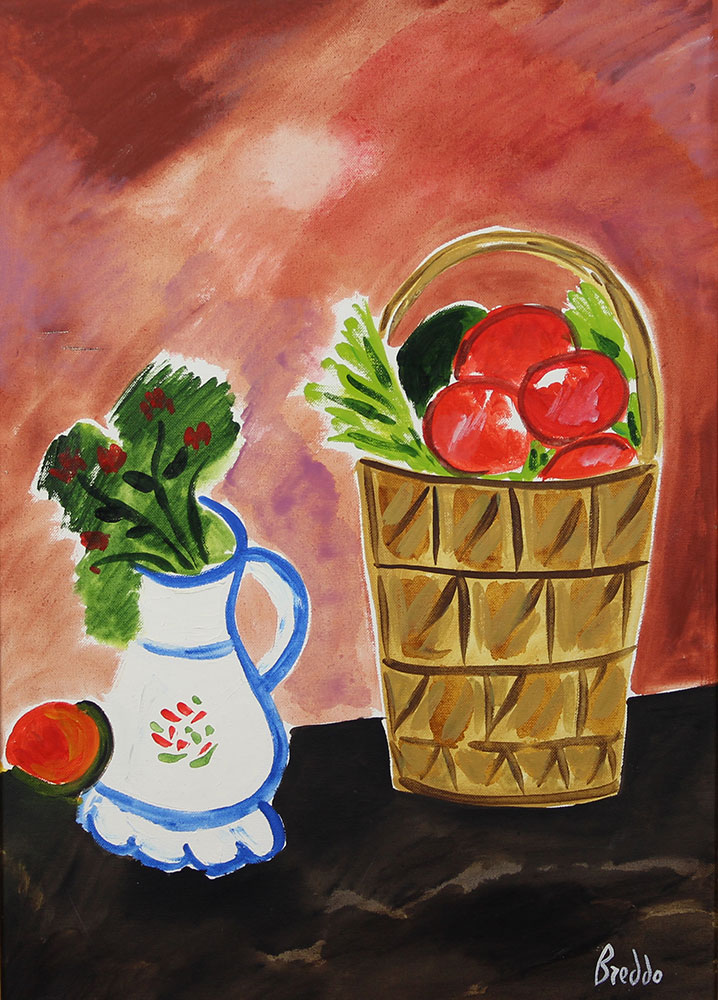 Breddo Gastone Natura morta olio su tela, cm. 70x50 firmato in basso a destra, certificato di autenticità della Telemarket, certificato di garanzia e autenticità della Casa d'Aste Meeting Art del 16/02/2004 e della Telemarket, l'opera presenta un piccolo restauro in centro a destra