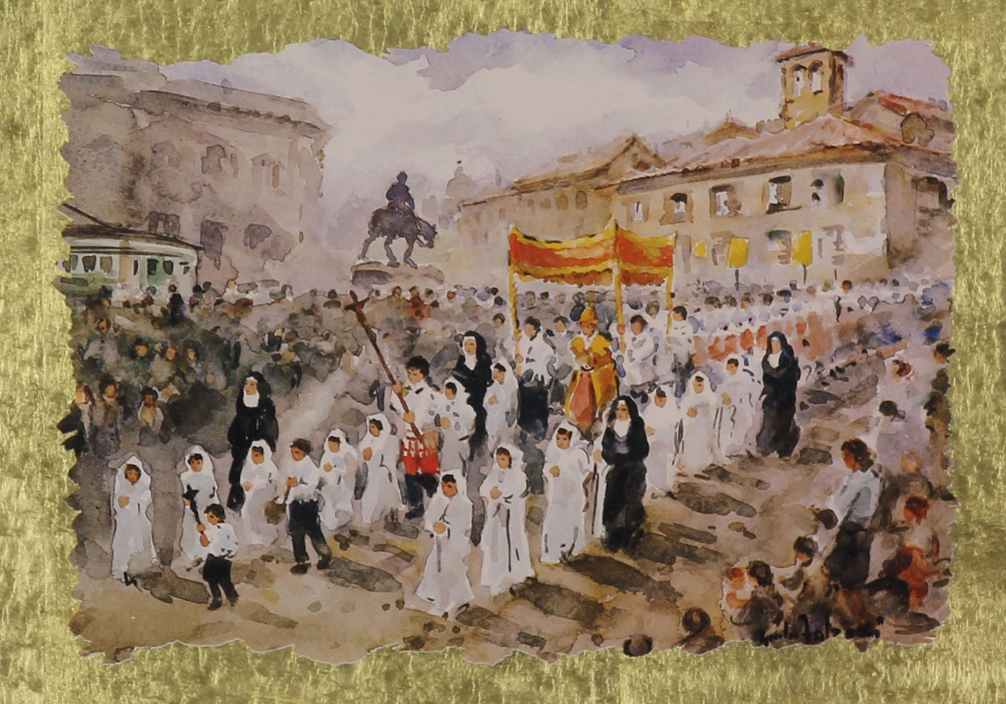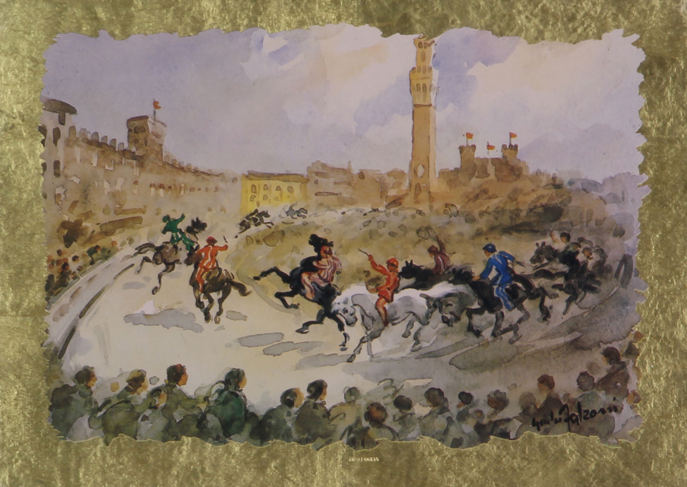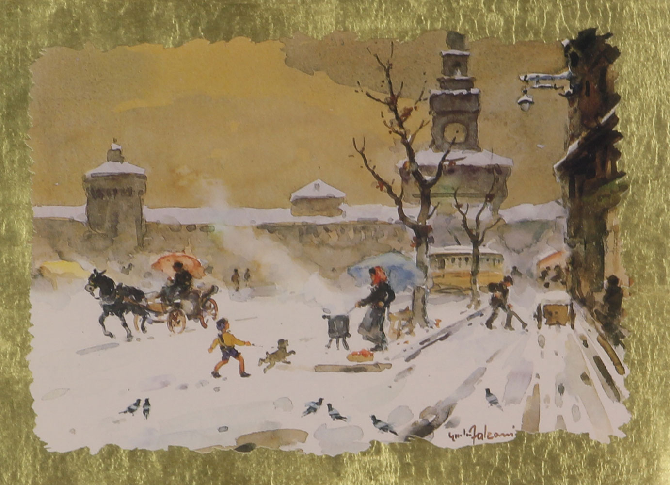Falzoni Giulio Senza titolo, 1970 lotto di 4 cromolitografie su foglia oro, cm. 13x18, es. prova d'autore tutte le opere sono firmate in lastra