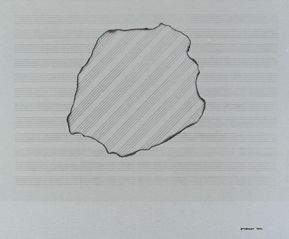 (ISAIA MABELLINI) SARENCO Vobarno (Bs) 1945 New music ex music, 1971 tecnica mista su alluminio applicato su tavola cm. 50x60, firma e anno in basso a destra, firma, titolo, anno e timbro dello Studio Brescia Arte Contemporanea (BS) al retro.