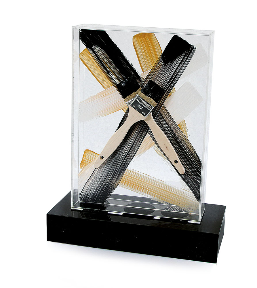 colore e applicazione di pennelli su plexiglass cm. 50x40x18, esemplare 78/100, firma in basso a destra sulla teca con base nera.