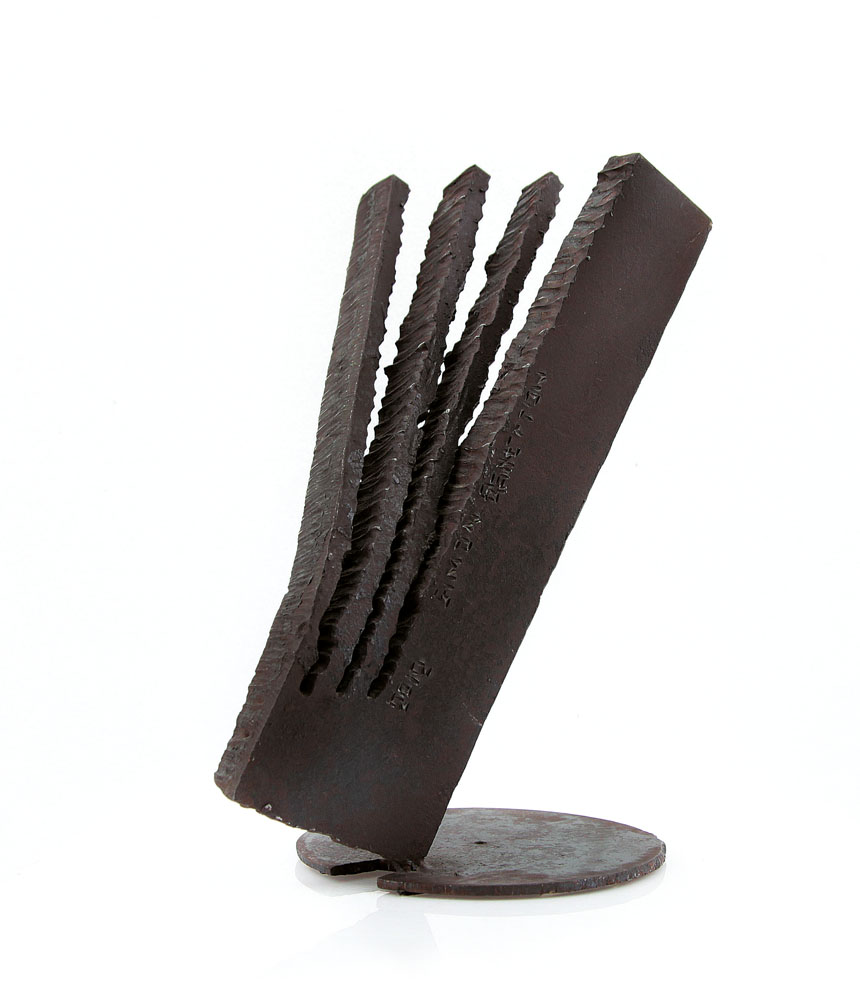 scultura in acciaio cm. 33,5x21x10, esemplare unico, firma e anno su un lato, dichiarazione d'autenticità dell'artista su foto, fotografia allegata ritraente l'artista con l'opera.