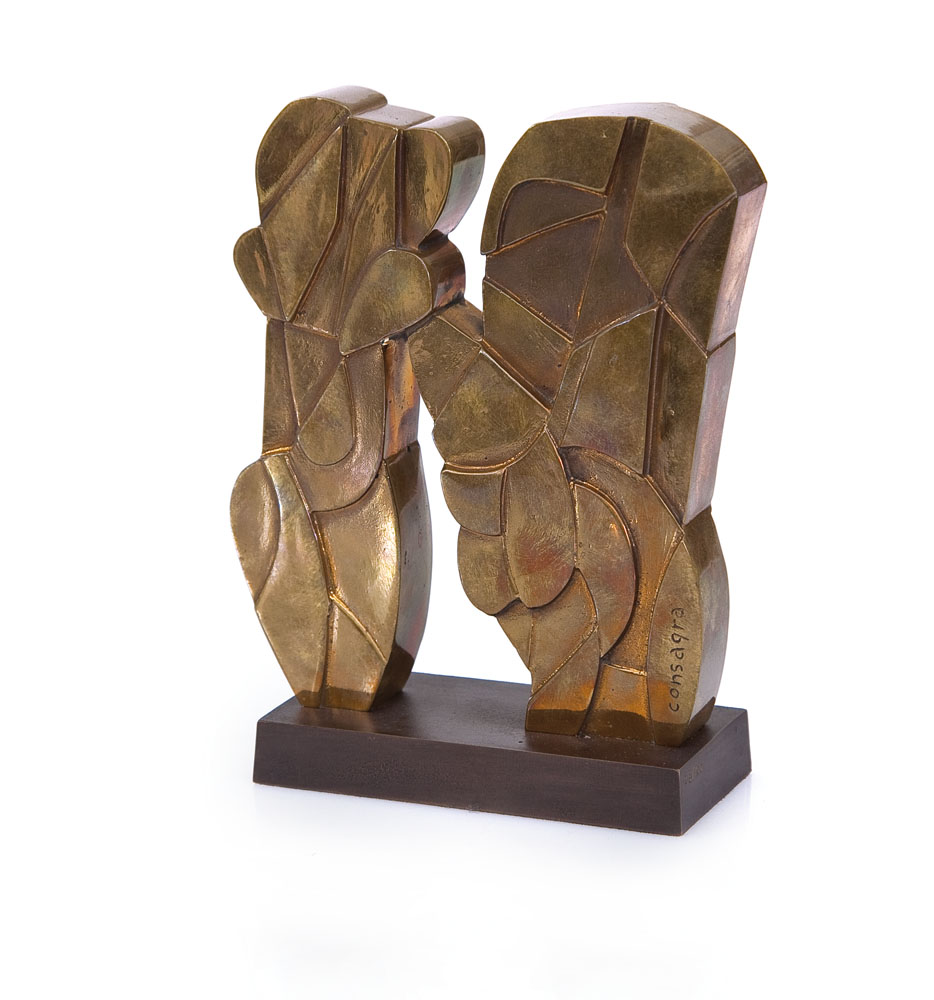 scultura in bronzo a cera persa cm. 18,5x13,5x5,5; esemplare 28/100, firma in verticale su un lato, tiratura alla base, opera realizzata in esclusiva per Farmitalia Carlo Erba, dichiarazione d'autenticità dell'artista e timbro della Galleria L'Agrifoglio su certificato di autenticità allegato, dichiarazione d'autenticità a cura della Prof. Gabriella Di Milia, Archivio Pietro Consagra (MI) su foto.