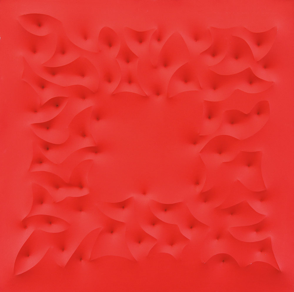 acrilici rossi su tela estroflessa cm. 76,5x76x4, firma e titolo al retro, dichiarazione d'autenticità dell'artista su foto, opera priva di cornice.