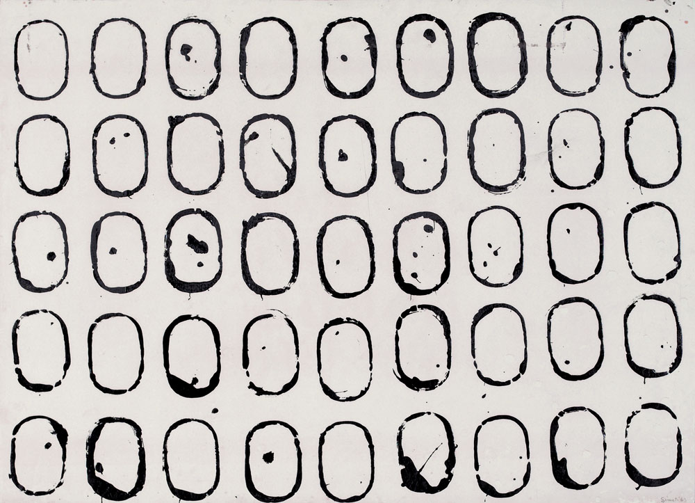 TURI SIMETI Alcamo 05/08/1929 45 ovali vuoti, 1963 smalti su carta applicata su tela cm. 48x67,5; firma e anno in basso a destra, dichiarazione d'autenticità dell'artista su foto.
