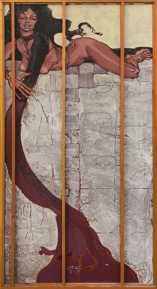 olio su tela cm. 200x100 con cornice dell'artista in legno con listelli frontali a copertura cm. 208x107, firma e anno in basso al centro, etichetta dell'artista al retro, presenta piccoli restauri alla tela visibili al retro.