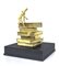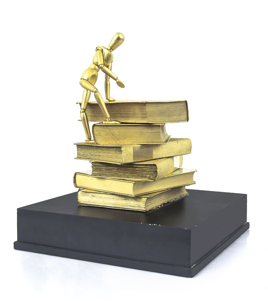 scultura, acrilici dorati e assemblaggio di libri e figura in legno con base in legno cm. 55x46x46, opera non firmata, dichiarazione d'autenticità dell'artista su foto, presenta difetti e sbeccature alla scultura e alla base.