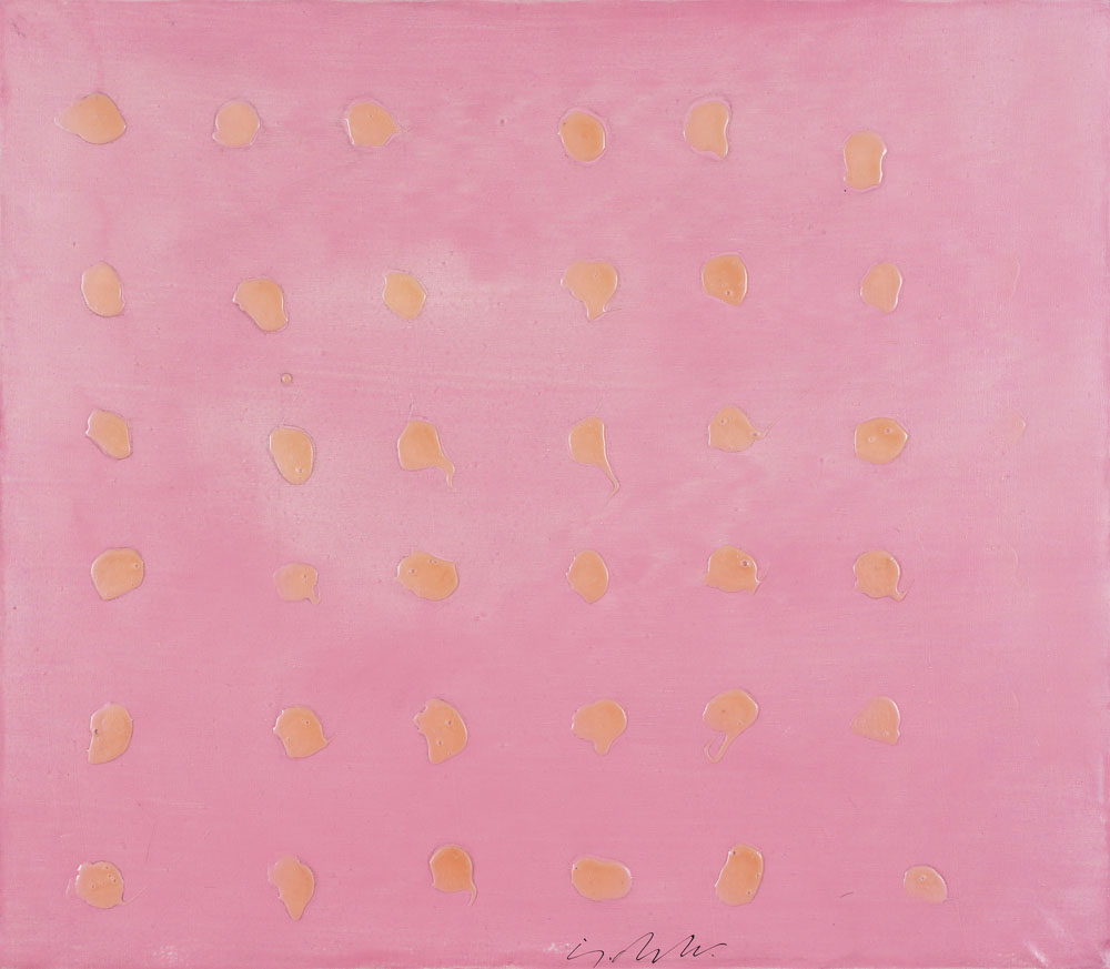 SERGIO DANGELO Milano 1932 Drops, 1973 tecnica mista su tela cm. 70x80, firma in basso al centro, titolo e firma sul telaio, etichetta della Galleria Annunciata (MI) al retro, dichiarazione d'autenticità della Galleria Annunciata (MI) su foto.